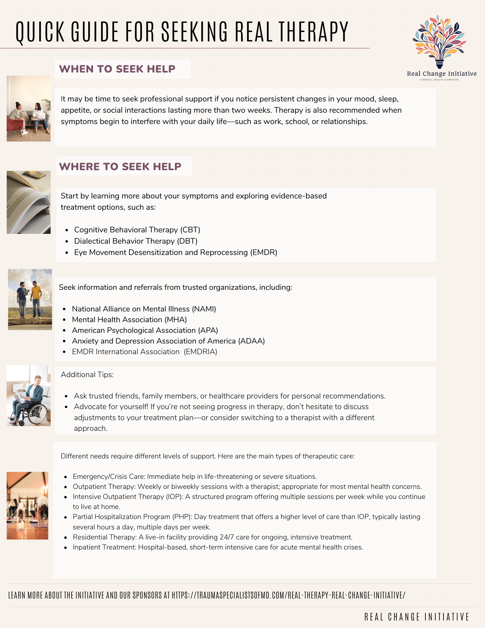 The Real Change Initiative is dedicated to promoting access to high-quality, evidence-based therapy that fosters real, lasting transformation. In a world where mental health support is increasingly commodified by large, impersonal platforms and AI-driven solutions, this initiative emphasizes the importance of working with trained, ethical, and compassionate therapists who provide individualized care. By raising awareness about the risks of inadequate or mismatched treatment and offering resources to help individuals find the right therapist for their needs, The Real Change Initiative empowers people to take control of their mental health journey. This initiative is vital in ensuring that those seeking support receive the depth of care necessary for meaningful healing and personal growth.